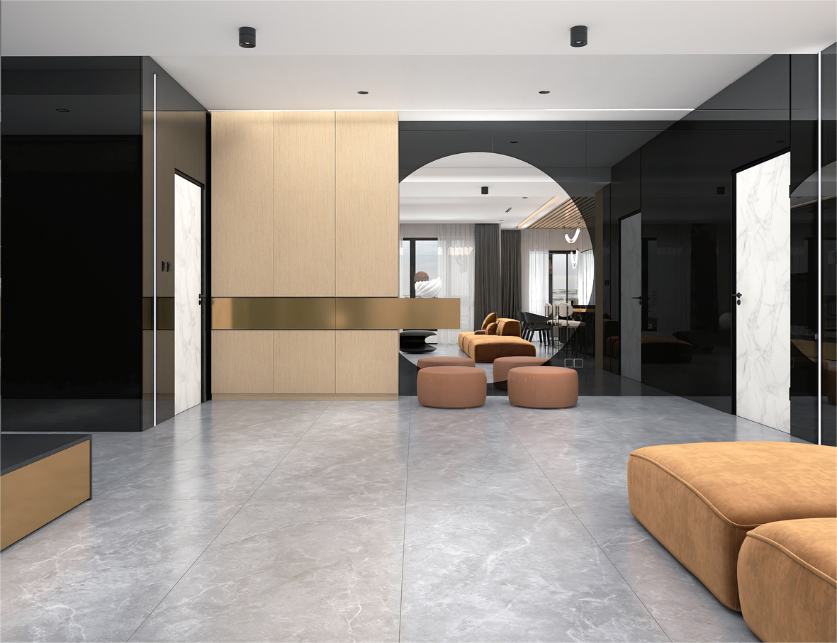 云博在线平台柔光砖结合亮光类瓷砖的高调明艳和哑光类瓷砖的低调内敛搭配效果,通过砖面柔抛工艺,使表面光线产生散射,降低产品反光率,自然呈现25°柔和光泽,打造出纹理细腻的质感肌肤面,营造出视觉舒适且具有艺术情调的温暖空间。